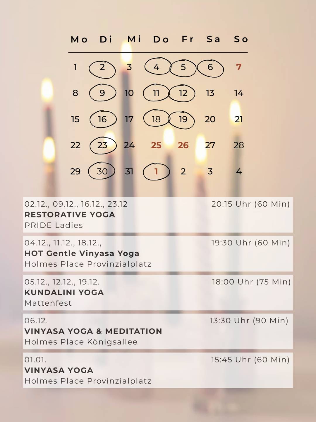 Wie oben bereits erwähnt, ist der Dezember sehr voll mit Terminen, sodass wir uns auch diesen Monat nur einmal online treffen werden - dafür dann aber 90 Minuten und mit einer kleinen Zeremonie für's Jahresende. Merke dir schon mal den 30.12. für Yoga & Meditation & Journaling um 10 Uhr vor.